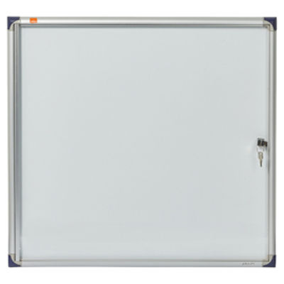Bacheca extrapiatta per esporre comunicazione in corridoi e passaggi stretti. Cornice in alluminio anodizzato con angoli in colore blu. Anta munita di serratura con due chiavi in dotazione. L'anta si apre con angolo di 135°. Telaio con fondo in metallo bianco brillante. Profondità interna per 11mm. fornita con normali fissaggi per il montaggio a parete. Dimensioni: 81,5x67cm è possibile esporre 6 fogli f.to a4