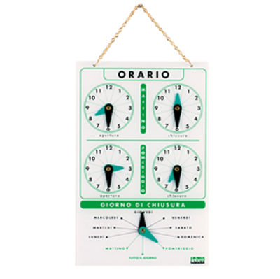 Cartello orario in acrilico con catenina in metallo per appendere. Formato: 13x20cm.