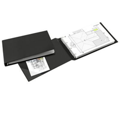 Raccoglitore in Colpan 2000® (cartone rivestito in PVC espanso), spessore 1 mm, con meccanismo a 4 anelli (a D) e tasca interna trasparente. Adatto a contenere documenti, disegni, poster, cartine geografiche, cartelli pubblicitari, stampe. Destinato a durare nel tempo. Formato esterno: 480x315 mm. Formato contenuto: 420x300 mm (A3 album, anelli sul lato corto). Dorso: 40 mm. Diametro anelli: 25 mm. Colore nero.